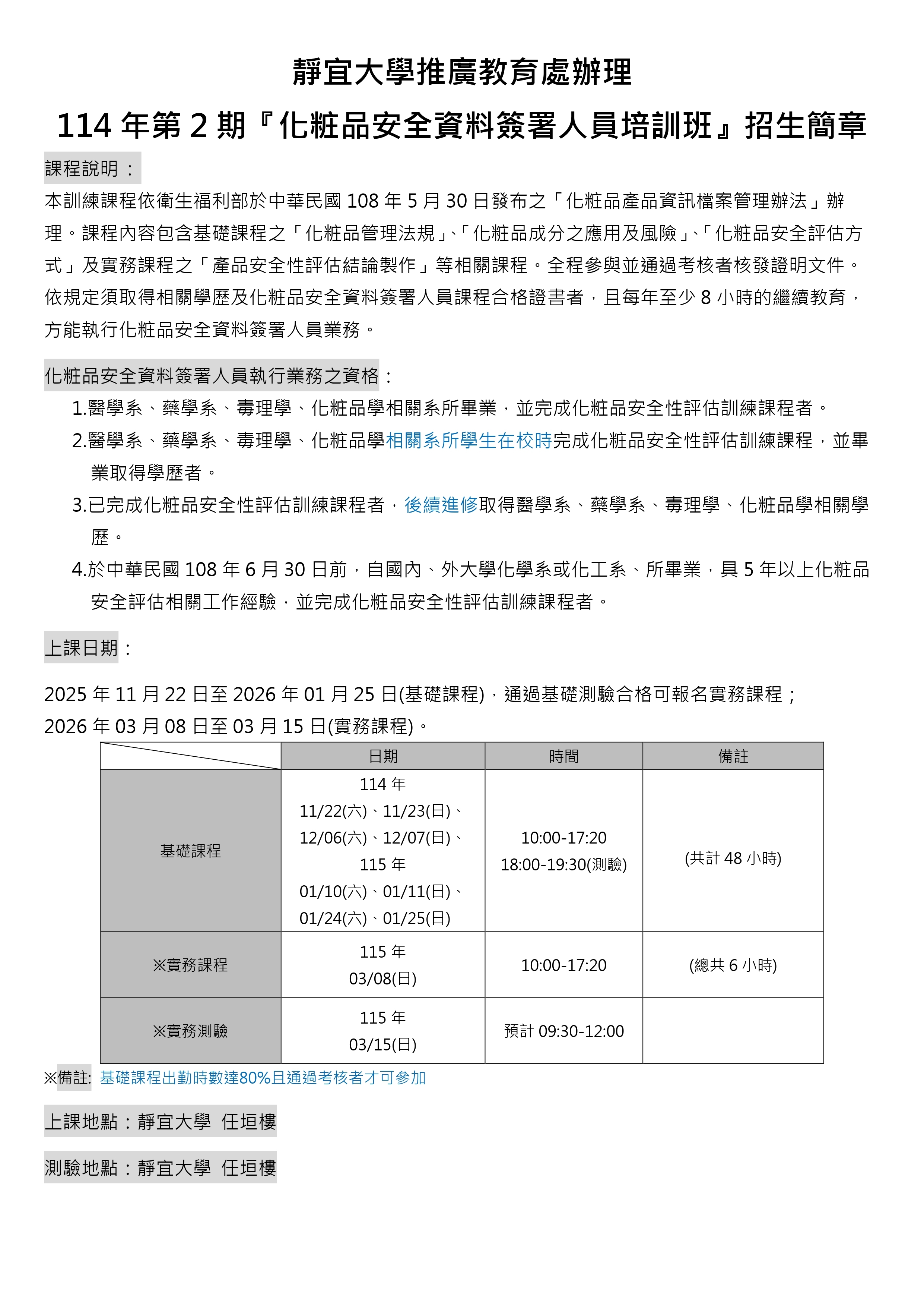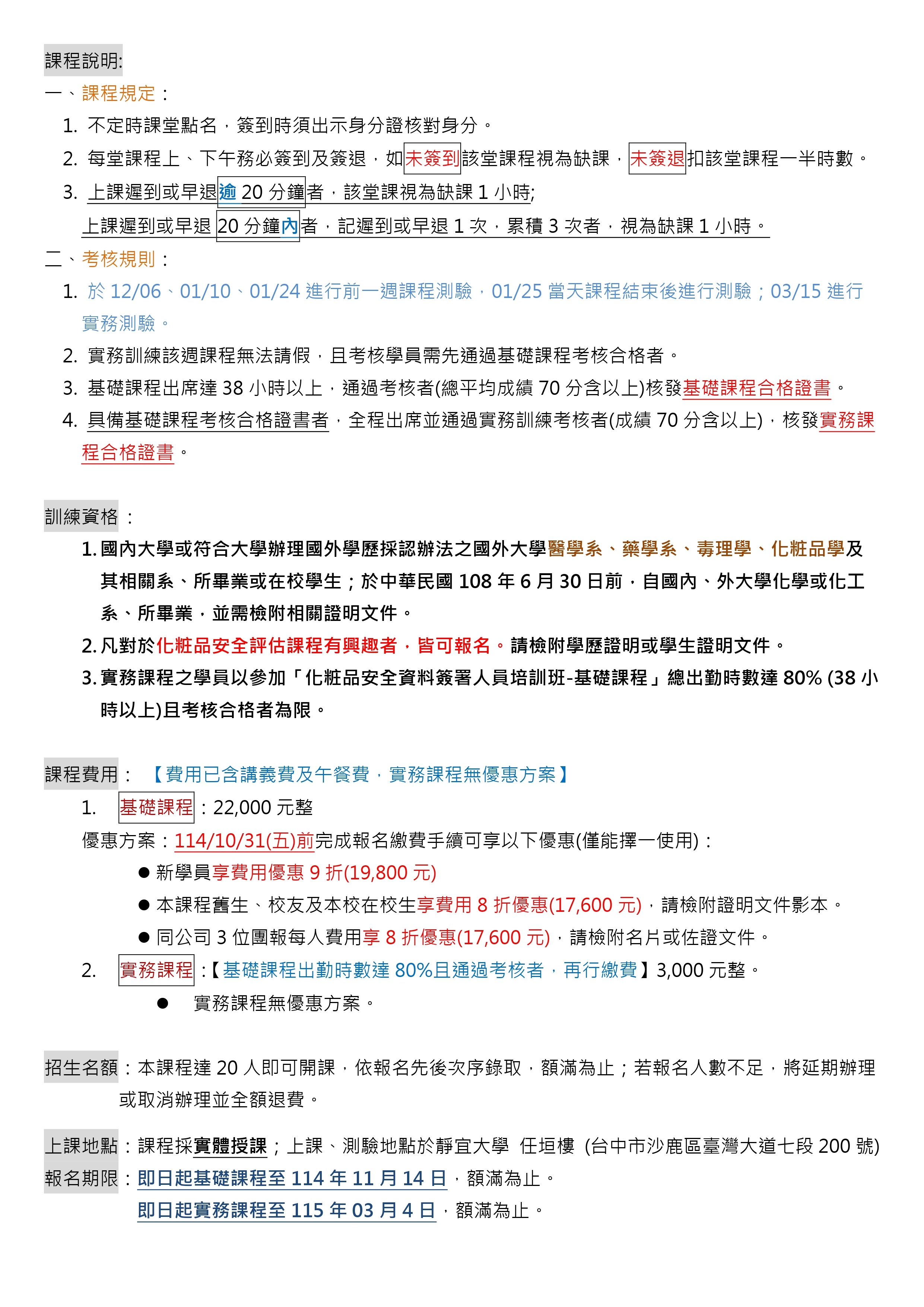 114年第2期化粧品安全資料簽署人員培訓班簡章(請點下載)