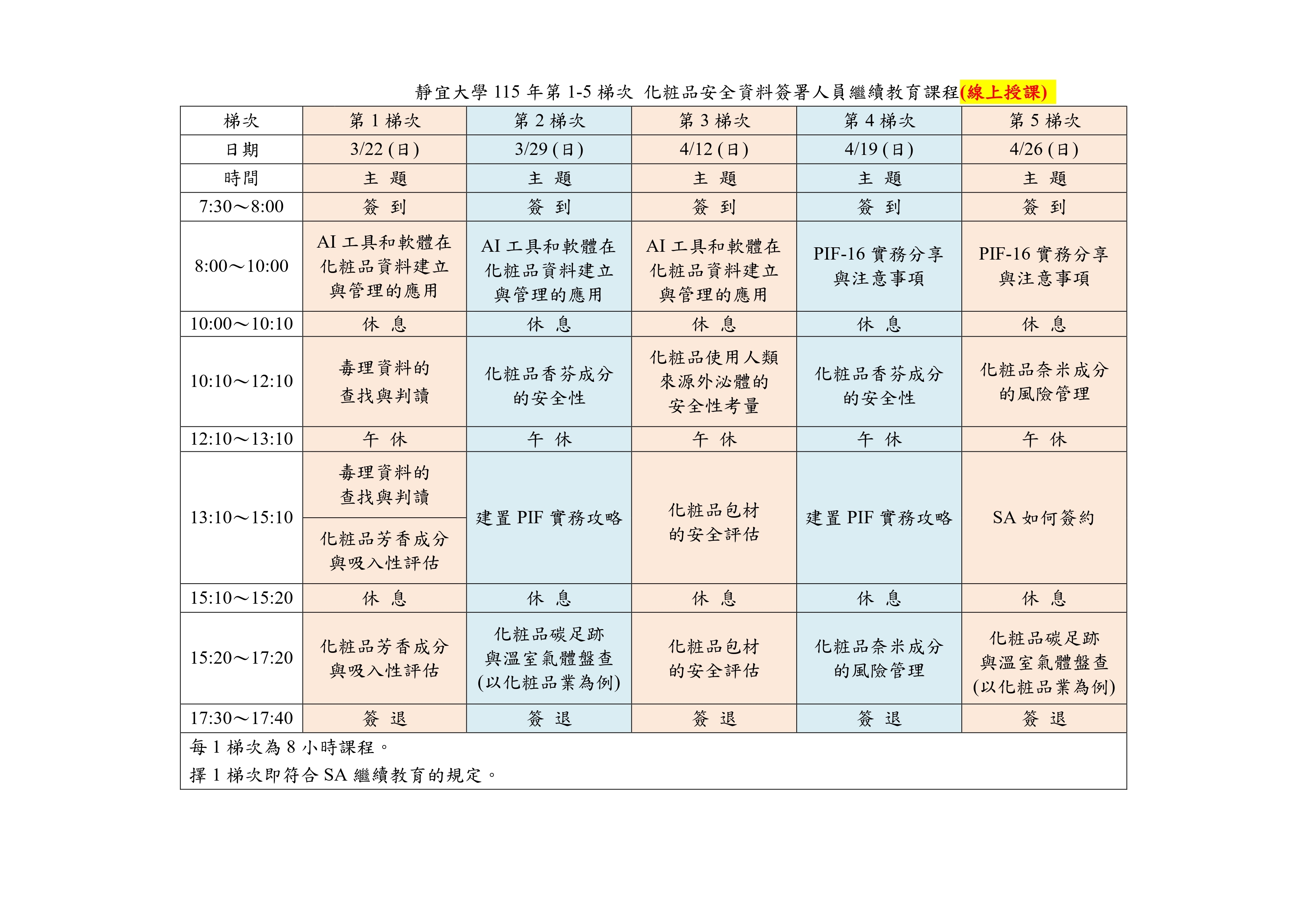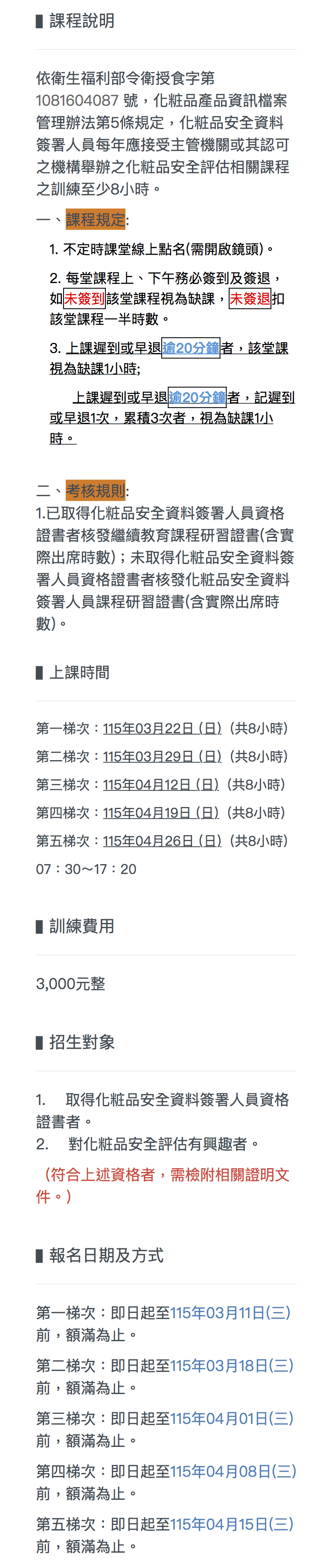 115年化粧品安全資料簽署人員繼續教育課程【線上課程版】簡章