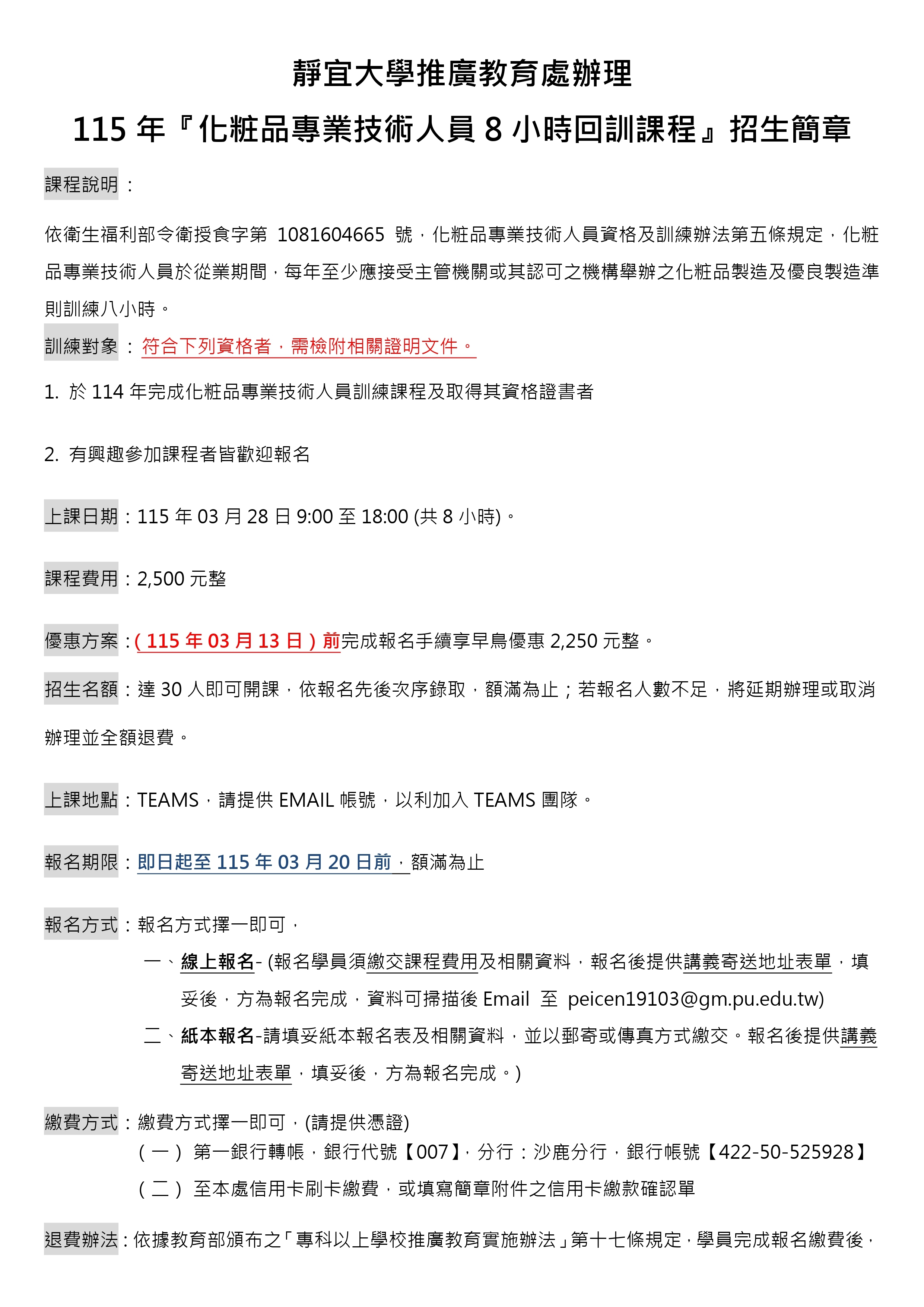 115年化粧品專業技術人員8小時回訓課程簡章(請點下載)