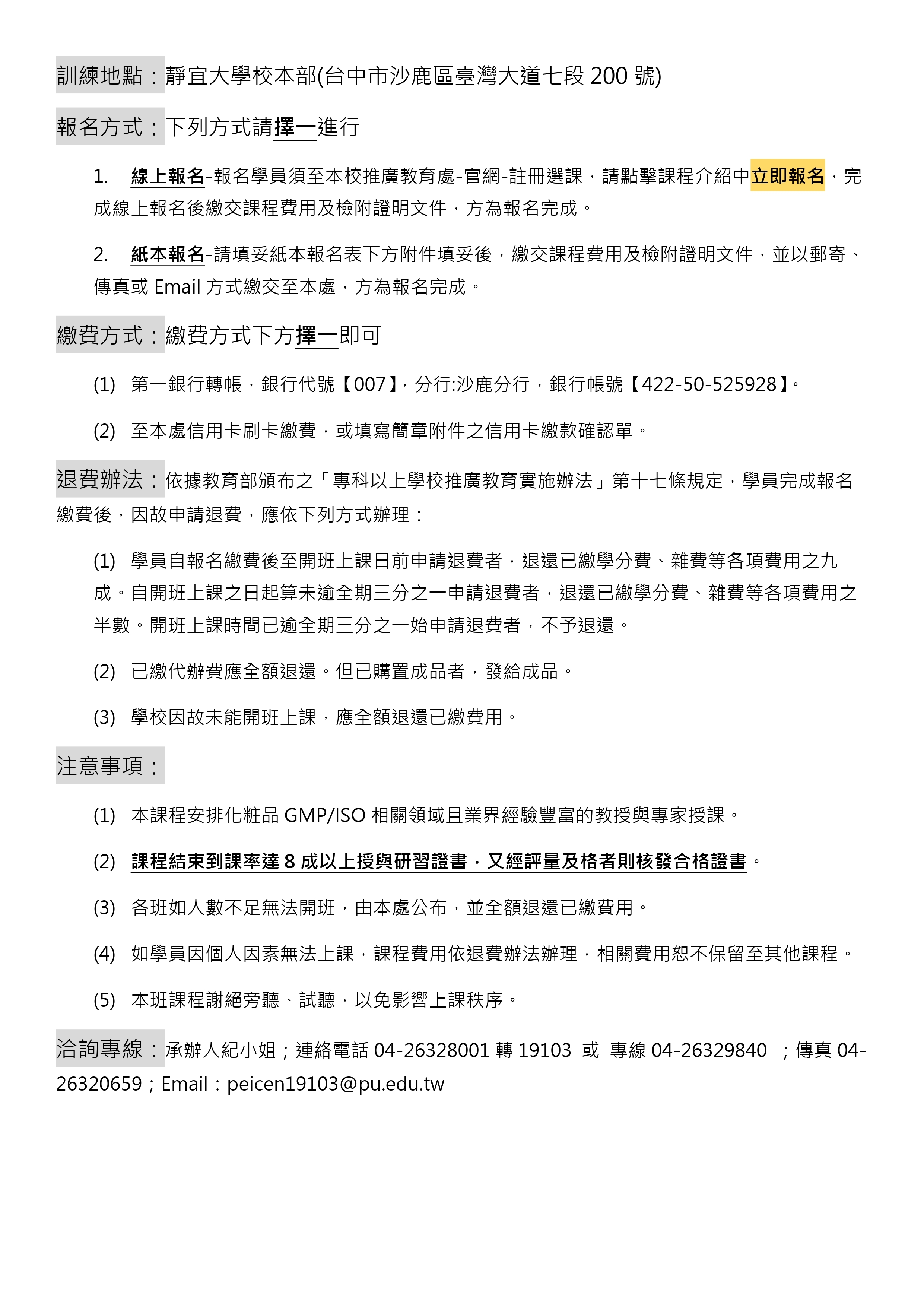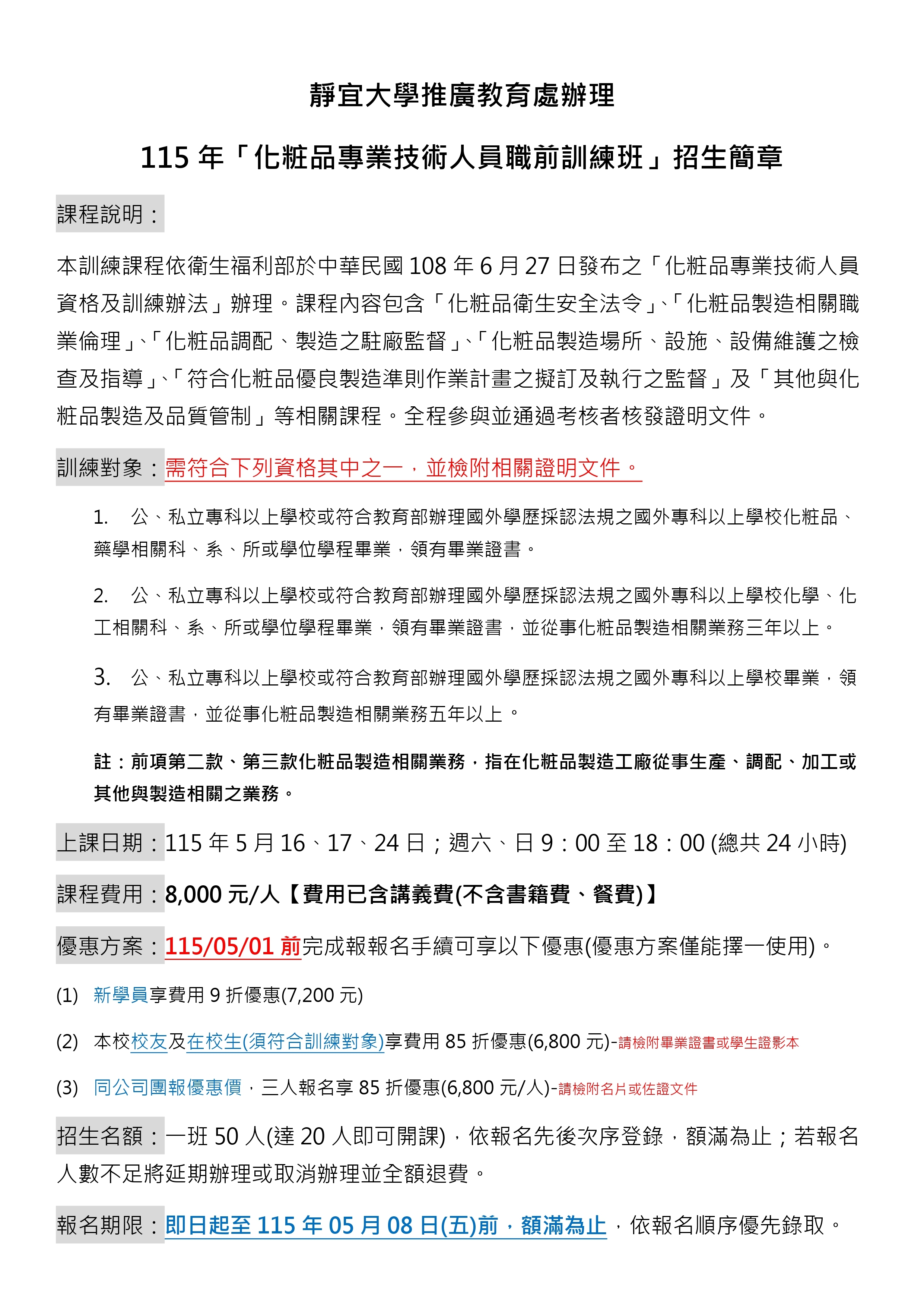 115年化粧品專業技術人員職前訓練班